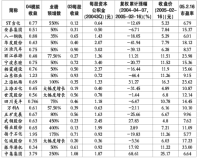 整体来看,预增股的表现大大优于市场平均水平。从2004年4月7日至2005年2月16日,沪综指下跌28.05%,204家预增股同期的平均跌幅不到15%,抗跌优势明显。但由于预增股在业绩基础、增幅程度、市场表现、估值状态等方面相差较大,后市的投资机会必然有很大不同。