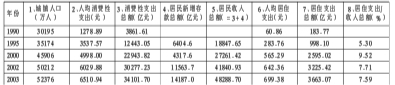 在中国目前条件下,城镇居民收入至少有两种不同的计算方法:一种方法是,以国家统计局每年公布的“城镇居民可支配收入”为依据。这种方法简单,可直接获得统计数据,但它可能与事实状况不尽相同。例如,在《中国统计年鉴(2004)》中,2003年全国城镇居民平均每人可支配收入为8472.20元,以此数字减去人均消费性支出6510.94元,剩余数为1961.26元/人,再乘以城镇居民人口52376万人,剩余总额为10272.30亿元,明显小于当年城镇居民新增储蓄存款13500亿元以上,且不说,城镇居民投资于国债、股票、基金证券等有价证券的资金和实业投资的资金也处于增长之中。另一种方法是,将城镇居民当年的消费性支出+新增储蓄存款+在国债、企业债、股票、基金证券等方面的金融投资+其他(如直接投资、保险等)。这种方法可能更切近实际状况,但相当复杂,在各项数据不全的条件下,很难得出准确结果。由于城镇居民每年投资于国债、企业债券、股票和基金证券等方面的新增数额相对有限,所以,一个可替代的方法是,以“每年城镇居民消费性支出+新增储蓄存款额”来大体估算城镇居民收入水平。