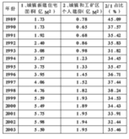 在发达国家,城镇居民每年的居住支出占其生活支出的比重通常在30%以上。但在表5和表6中,中国城镇居民的居住支出在最高年份也仅为10%左右,而在年收入快速增长的条件下,又呈下落走势。与2000年相比,2003年城镇居民收入总额增长了69.04%,而居住支出却从9.43%降低到7.59%。这种变化在一定程度上反映了城镇居民购买商品住宅的需求能力。