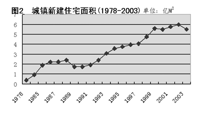 从以上两方面数字来看,城镇每年需要新建10亿平米左右的住宅才能满足城镇居民日益增长的住宅需要。但全国每年新建的住宅面积远远不能满足这些需要。如图2所示,1999年前每年城镇新建住宅面积长期低于5亿平米;1999年突破了5亿平米以后,连续5年徘徊于5亿平米-6亿平米之间,始终没有突破6亿平米。2003年城镇新建住宅面积仅5.50亿平米,不仅低于2001年的5.75亿平米和2002年的5.98亿平米,而且低于1999年的5.59平米。这意味着,每年有40%以上的住房需要量不能得到满足。