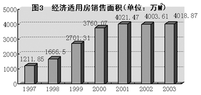 值得特别提出的是,为了平抑商品住宅价格同时满足中低收入群体的购房需求,各地政府加大了经济适用房屋的建设。从图3中可见,与1997年相比,2003年的经济适用房销售面积增长了231.63%。但即便如此,房价依然呈现上升走势。