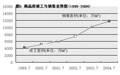 从图4中可见,2004年房地产的实际投资,在2月份达到高点以后就快速下落,3-7月份的同比增长率分别为41.1%、34.6%、32%、28.7%和28.6%。与2月份相比,7月份的增长率下降了28.5个百分点。与2001-2003的3年间同期相比,2004年7月份的投资增长率分别下降了3个百分点、2.1个百分点和5.5个百分点。这种投资增长率快速回落的走势,一方面反映了宏观紧缩的效果,另一方面也预示着未来一段时间内商品住宅的供给收紧状况。