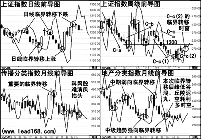 前导系统对周波段时空过程的研判是:大盘当前仍处于C-c(2)反弹过程。这个看法沿续了2004年11月和12月之交作出的“大盘开始进入熊市大C浪之C-c大浪”的分析。需要指出的是,周前导图V形上方C-c(2)区间的强运行时空过程已经比较长,与周K线可能弱向转移的临界位置较为接近,2月和3月之交周波段可能明显转移,波段强弱轮替和交换的法则将发生作用,大盘很可能在进入3月份时出现月线和周线时窗之间不能共振的局面,月线级K线自去年10月以来的总体震荡下行态势可能难以改变。
