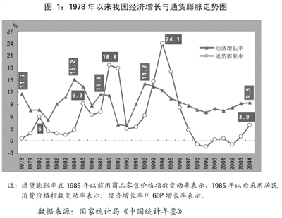 1978年改革开放以来,我国经历过多次通货膨胀,分别发生在1980年、1984-1985年、1988-1989年、1993-1994年和2003-2004年。1998-2002年我国还出现了长达5年的通货紧缩,价格水平一直处于0附近。2002年底开始,我国经济出现过热苗头,2003年价格上涨再次抬头,2004年达到3.9%。
