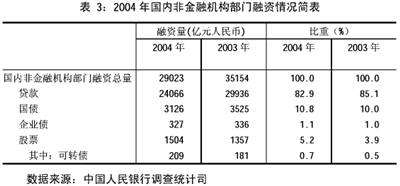 2004年,金融市场进一步规范发展,金融产品创新和制度建设取得新进展。贷款融资比重下降,国债和股票融资比重上升,融资格局有所优化。2004年,国内非金融机构部门(包括住户、企业和政府部门)以贷款、股票(可流通上市股票的筹资部分)、国债和企业债四种方式新增融入的资金总计为2.9万亿元(本外币合计),同比少融资6131亿元,下降17.4%,主要是贷款融资同比下降19.6%,国债融资同比下降11.3%。国内非金融机构部门贷款、国债、企业债和股票融资的比为82.9:10.8:1.1:5.2。