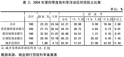 根据中国人民银行对全国金融机构2004年第四季度贷款利率浮动情况的调查统计显示,2004年第四季度金融机构发放的全部贷款中,实行下浮利率的贷款占比为23.23%,比三季度上升2.43个百分点;实行基准利率的贷款占比为24.56%,比三季度下降4.54个百分点;实行上浮利率的贷款占比为52.21%,比三季度上升2.11个百分点。金融机构贷款利率在2004年10月29日新增的贷款利率浮动区间内,即商业银行贷款利率在基准利率的1.7倍以上、城市信用社贷款利率在(1.7,2.3)和农村信用社贷款利率在(2,2.3)的区间内均有分布。其中,在基准利率2倍以上区间内,金融机构的贷款占比为2.68%,贷款利率更好地覆盖了贷款的风险溢价。