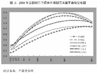 2004年全年全国银行间债券市场国债收益率曲线(下称曲线)从总体上看呈上升趋势,大致可分为五个阶段:第一阶段,即1月至4月初的缓慢上移阶段。第二阶段,即4月中旬至4月末的快速上移阶段。在4月12日央行宣布上调法定准备金率0.5%后,曲线在一个星期内快速上升至40个基点左右;加之当月CPI首次上升超过3%,至4月29日曲线再次上移50个基点超过年初近100个基点。第三个阶段,即5月8日至10月29日的振荡下移阶段。由于“五一”节后未能加息,加之宏观调控有效,从5月8日起曲线从高位下移;但因7、8、9三个月CPI在高位运行,曲线下移幅度较小。第四阶段,即10月29日至11月24日的曲线快速上移阶段。在10月29日升息0.27%后,曲线又快速上升至4月末水平。第五阶段,即11月末至年末的下移阶段。由于资金面相对宽松,债市转暖,12月末曲线回落到与年初相差60多个基点左右。