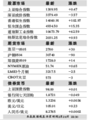 股票市场 最新 涨跌 上证综合指数 1309.95 0.47 深证成份指数 3379.49 -3.57 香港恒生指数 14060.91 102.97 恒生国企指数 4934.5 15.35 道琼斯工业指数 10673.79 62.59 纳斯达克综合指数 2031.25 0.93 期货市场 最新 涨跌 连豆一0505 2700 30 沪铜0504 30740 -90 郑强麦0509 1728 14 NYMEX原油 51.74 0.65 LME3个月铜 3217.5 -2.5 CBOT大豆 573 -3 债券货币 最新 涨跌 上证国债指数 98 0.01 银行间七天回购 1.8721 -0.049 欧元/美元 1.3236 0.0036 美元/日元 105.01 0.23 人民币/美元 8.2765 0.0002 本表数据截至北京时间2月24日 22:30