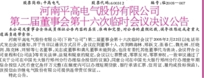 河南平高电气股份有限公司(下称“公司”)第二届董事会第十六次临时会议于2005年2月22日以电话形式发出会议通知,并于当日以通讯方式召开,会议应到董事十人,实到韩海林、郑跃文、张春仁、魏光林、任晓剑、陈克林、刘韧等七名董事,关志成董事和龚凡董事未能到会,也没有委托其他董事代为表决。会议符合公司章程和《公司法》等有关法律、法规和规章的规定。会议以七票赞成,零票反对,零票弃权,一致审议通过了《关于公司在中国光大银行郑州分行办理综合授信的议案》,同意公司在中国光大银行郑州分行办理壹年期综合授信人民币壹亿叁仟万元整(在额度内可以办理短期贷款、银行承诺汇票、信用证、履约或投标保函),该授信由许继电气股份有限公司提供连带责任保证。。