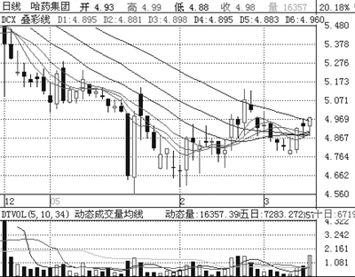 叠彩线指标选股:哈药集团(600664)现价4.98元。该股前期调整相当充分,4.7元附近开始有承接盘出现,叠彩线组(一)重新交叉向上,短线技术形态转好,后市酝酿补涨机会,值得关注。关注位4.90元,止损位4.70元。