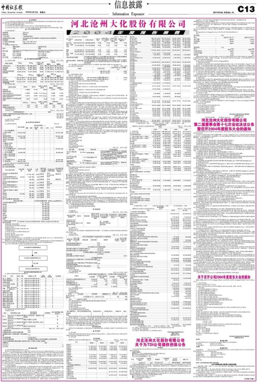 鉴于在2004年4月13日召开的沧州大化2003年度股东大会上通过的沧州大化为TDI公司提供为期一年累计不超过沧州大化2001年底净资产百分之五十的贷款担保额度的权限已经到期,根据TDI公司资金周转需要,申请沧州大化继续提供贷款担保。沧州大化董事会根据TDI公司实际情况,提请股东大会继续授权本董事会:从2005年4月30日起三年内,沧州大化公司可向TDI公司提供累计不超过公司最近一期经审计的净资产的百分之五十的贷款担保。