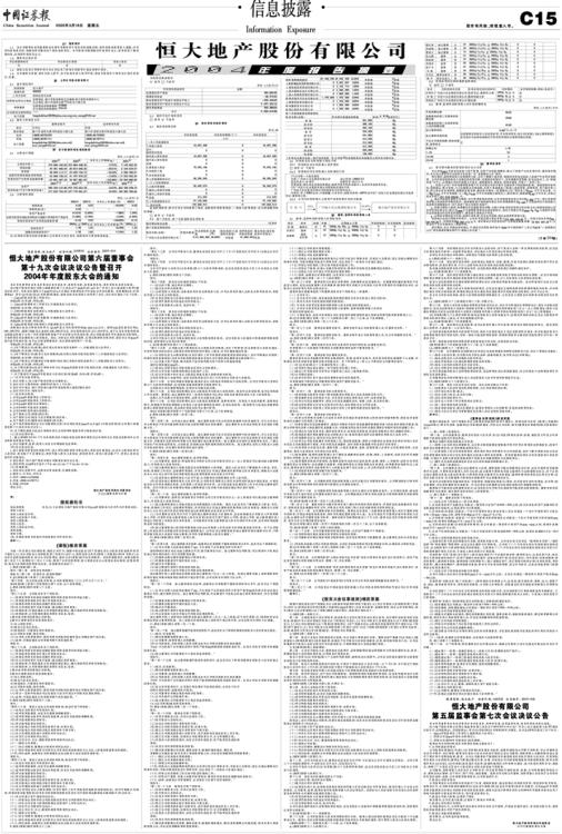 恒大地产股份有限公司第六届董事会第十九次会议于2005年3月16日在广州市工业大道金碧大世界7楼会议室召开。本次会议通知已于2005年3月6日分别以书面或电话方式送达公司各位董事。应到董事8名,实到董事8人,符合《公司法》及《公司章程》的规定。监事会成员及高管人员列席了会议。会议审议通过了以下议案: