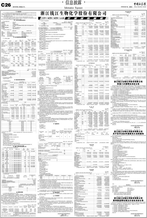 浙江钱江生物化学股份股份有限公司董事会于2005年3月16日在本公司会议室召开了第四届董事会第八次会议。会议决定于2005年4月23日召开公司2004年度股东大会,现将具体事宜通知如下: