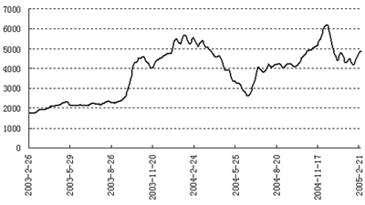 新船订单数量上升难以消除运力缺口。根据测算,全球干散货运力在2005年的增长应在7%以下,将难以消除需求旺盛所造成的运力缺口,因此估计2005年BDI指数仍将主要在4000点以上区域运行。同时,2005年全球油轮运力增长不会太快,预计运价指数与2004年基本持平,即使出现下降其幅度也应相当有限。