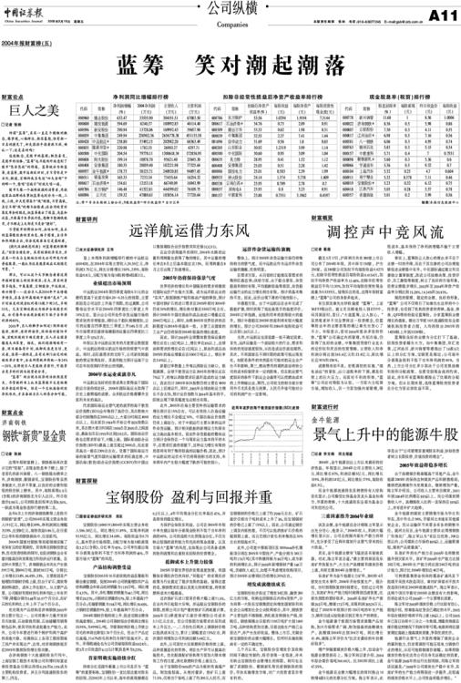 中远航运2004年第四季度每股0.31元的业绩明显高于此前市场0.20-0.25元的预期,主要原因是公司运价上升高于预期。经过测算,公司整体运价水平在2004年四季度比三季度上升10%左右,显示出公司所处件杂货运输市场的需求依然非常强劲。同时由于船队规模增加,公司的运量在四季度比三季度上升34%左右,此外市场需求旺盛使每艘船的运量在四季度比三季度上升12%左右。