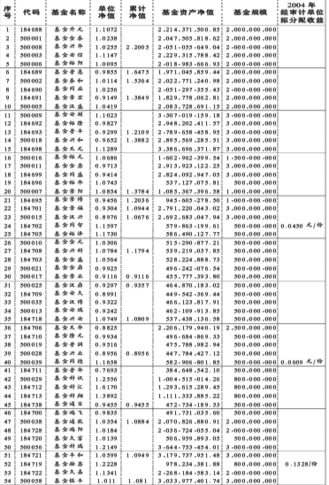 注:1、本表所列4月1日的数据由有关基金管理公司计算,基金托管银行复核后提供。 2、基金资产净值的计算为:按照基金所持有的股票的当日平均价计算。 3、累计净值=单位净值+基金建立以来累计派息金额。 4、未经审计的单位拟分配收益由基金管理人根据基金上年度单位可分配收益,按照《证券投资基金管理暂行办法》规定的收益分配比例(至少90%)计算、基金托管人复核后得出,未经会计师事务所审计,在有关财务数据经过会计师事务所审计后,基金单位净收益、单位分配收益及其权益登记日、红利派发日等收益分配有关事项,以基金年报和基金分红派息公告为准。 |