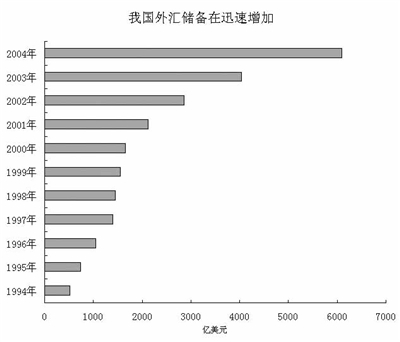 截至2004年12月末,我国外汇储备余额为6099亿美元,比上年增加2067亿美元,相当于商业银行在央行的准备金存款增加了17000亿元。
