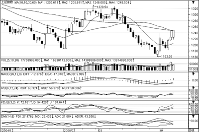 红柱逐渐放大,DIFF、DEA金叉向上,转强。快速RSI继续向超买区挺进,仍有上攻的潜力。KD继续强攻,J值开始超买,反弹有望延续。PDI、MDI金叉,强势基本确立。