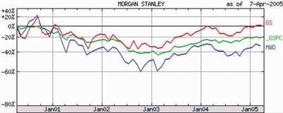 “内战”的命运与摩根的业绩息息相关。摩根与添惠联姻之初,恰好赶上了金融证券市场的繁荣期,上世纪90年代后期华尔街的欣欣向荣掩盖了摩根内部的噪音。分析师指出,正是繁荣的市场使大家忘记了一些不和谐的声音,而当市场转淡时,一切就都凸显了出来。在过去5年中,摩根士丹利股价下跌了34%,表现远远落后于死对头高盛公司,而同期标准普尔投资银行分类指数只下跌了16%。裴熙亮的反对者将公司股票表现作为评价其领导能力的一个标准。而大摩官方对此的解释是,在互联网泡沫时期,摩根士丹利的承销业务几乎是排在第一的位置。但最近几年中,科技企业承销业务的下滑对公司的冲击要比其他投行大得多。