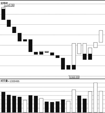结合宝塔线我们发现,4月1日宝塔线红柱首次超过绿柱后,已经连续6个交易日向好,因此本次中期上升通道的形成应视为有效,大盘中级行情已经展开。在这种情况下,我们可以把V型的低点——1162.03点确认为大盘的中期底部,在未来6个交易月内,该底部不会被轻易击穿。