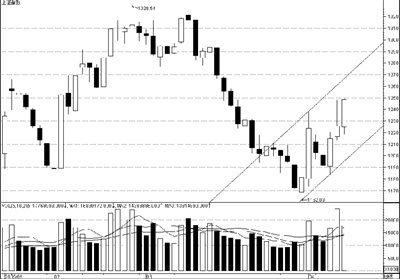 从通道线分析,目前大盘的中线上升通道已经悄然形成。该上升通道的下轨由3月31日的最低点1162.03点和4月6日的最低点1183.91点连接而成;上轨是在4月1日高点1237.80点作下轨的平行线。目前,上证指数收盘于1248.52点,已经明显位于该上升通道的中间位置。从技术上看,大盘短期下降趋势已经终结,中期上升趋势正在展开。同时,从成交量方面看,自4月1日到4月8日5个交易日的时间,大盘的成交量基本处于上升状态,符合上升通道初期对成交量的要求。