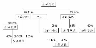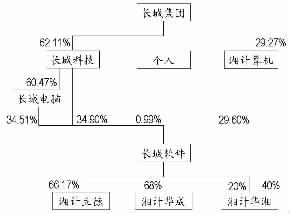 2005年4月8日,本公司与长城科技、长城电脑、霍纪才、傅强签署合同,由本公司及长城电脑共同以货币资金对长城软件进行增资:本公司总投资额等同于长城软件收购本公司在湘计立德、湘计华成、湘计华湘股权的对价,为4973.83万元。根据长城软件注册资本与所有者权益1:1.005的比例计算,4973.83万元中的4949.07万元作为对长城软件的出资,24.75万元计入长城软件资本公积金。长城电脑投入资金总额为17,772,100元,其中17,683,623元作为对长城软件的出资,88,477元计入长城软件资本公积金。增资完成后,长城软件的注册资本增加至167,174,305元,股权结构变为如下图所示: