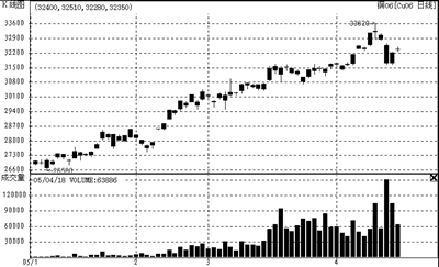 周一沪铜0506合约上涨300点,收盘32350。在伦铜强势回补带动下,沪铜跳空高开。现货价格支撑期货价格反弹,虽然上周有货到港,但并未从根本上解决供应紧张问题。后市仍将是震荡整理,操作上建议当日短线交易。(李跃东)