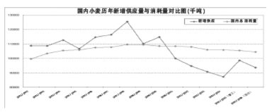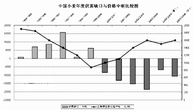 目前中国小麦消耗量维持在1.05亿吨左右水平,比1997/1998年度的1.096亿吨有所下降,但总体比较稳定。不过近年产量水平的波动比较大,产量从1997/1998年度的最高1.23亿吨,一路下降到2003/2004年度的最低8571万吨,2004/2005年度产量出现大幅反弹,达到9116.2万吨水平,加上750万吨的年度进口,该年度小麦新增供应已经接近需求,从而大大缓解了国内小麦市场的“紧平衡”状态,也是直接导致该年度后期现货价格下跌的直接诱因。通过对中国小麦年度供需缺口数量变化与历史年度价格中枢对比研究,笔者预测2004/2005年度国内三等白麦价格中枢位于1500元/吨,而2005/2006年则达到1600元/吨。