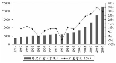 然而,进入2004年以后,形势发生了明显变化。尽管乳品行业仍保持了较快的发展,但增速放缓,竞争加剧。主要乳品加工企业开始根据消费市场的容量调整产能,不再贸然扩产,反映在原奶需求上,就是需求的绝对量仍在增加,而供需缺口趋小,奶价逐渐失去了继续上涨的支撑。