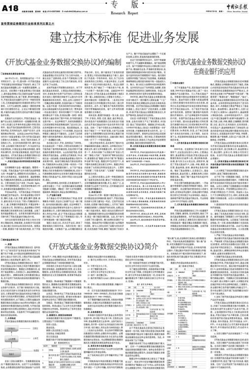 实践表明,《开放式基金业务数据交换协议》在我国开放式基金市场发展中起到了十分重要的作用,促进了整个适才的快速、规范发展。它的广泛应用说明了技术规范在业务创新中不可或缺的作用。