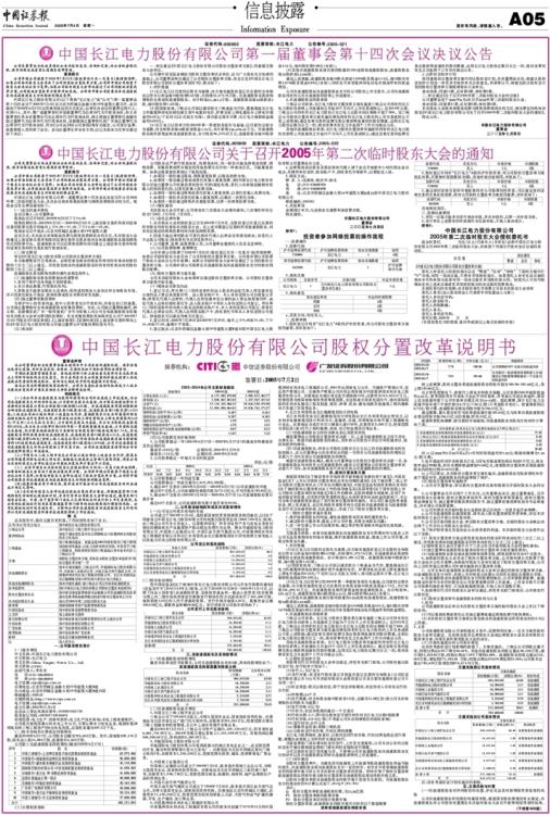 中国长江电力股份有限公司第一届董事会第十四次会议决定召开公司2005年第二次临时股东大会,本次会议将采取现场投票与网络投票相结合的方式。现将会议有关事项通知如下: