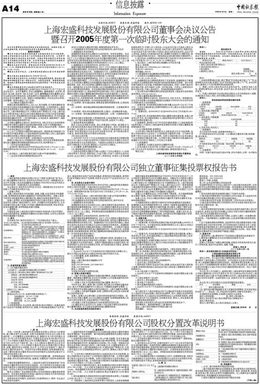上海宏盛科技发展股份有限公司(以下简称“宏盛科技”或“本公司”)独立董事张志高先生、吴宪和先生和刘红忠先生一致同意刘红忠先生作为征集人向全体流通股股东征集拟于2005年8 月8 日召开的本公司2005年度第一次临时股东大会的投票权。