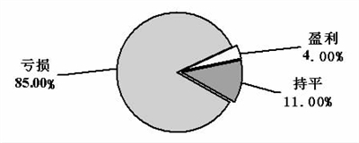 中小投资者上半年收益状况的调查结果如下:表示“亏损”的被访者有85%;表示“持平”的被访者为11%,还有4%的被访者表示“盈利”。与2004年年底80%亏损、15%持平、5%盈利的调查结果相对照,“盈利”的比例少了1个百分点,“亏损”的比例进一步扩大。