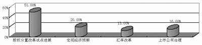 谈到下半年影响行情的主要因素,有51%的投资者认为,股权分置改革试点工作的进展,是影响下半年行情最主要的因素。此外,有26%的投资者认为,对宏观经济的预期、上市公司治理以及汇率改革,也将会影响到下半年行情的变化,分别占被调查者的20%、16%和13%。