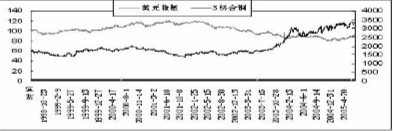 美元指数是通过加权平均美元与六种主要国际外汇汇率得出的,反映了美元综合水平。长期以来,伦铜遵从“美元升值,铜价下跌;美元贬值,铜价上涨”这一基本规律。在2001年7月6日美元指数见顶,达到119.9高位之后,伦铜在数月之后的2001年11月5日见底1358美元。其后,美元指数不断创出新低,直到2004年12月29日到达80.97最低价。这一阶段,伦铜则从1358美元/吨上升到3118.5美元/吨。此后,美元升值,美元指数升至2005年7月27日的89.73。按理,这段时间铜价应随着美元走强而下跌,可是铜价不仅没有下跌,而是在背离美元轨道上疯涨,最高升至3500多美元。