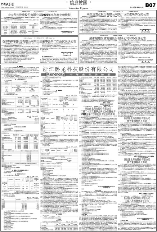 浙江卧龙科技股份有限公司2005半年度报告摘要