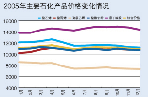 另一方面,由于国内工业品价格整体趋于稳定,因此石化产品价格也难以大幅上涨。统计表明,2005年1—11月国内工业品出厂价格同比涨幅逐月回落,其中11月份为3.2%,比前11个月平均涨幅低1.9个百分点,已降至2004年以来的最低值。同时,原材料、燃料、动力购进价格涨幅也明显回落。因此预计2006年工业品价格将继续趋稳,石化产品价格也难以继续大幅上涨。