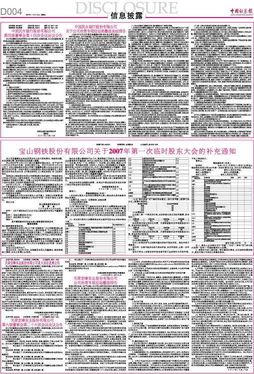 宝山钢铁股份有限公司关于2007年第一次临时股东大会的补充通知
