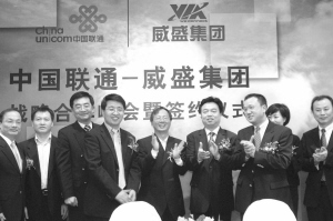 12月18日,联通集团和威盛集团在北京联合宣布,联通将和威盛签约,在联通的CDMA手机采购中引入基于威盛CDMA芯片的手机产品,双方同时还将在包括手机芯片技术、智能手机技术等领域进行全方位战略合作。图为中国联通公司副总裁杨小伟(右三)与威盛集团总经理陈文琦(右四)祝贺合作成功。