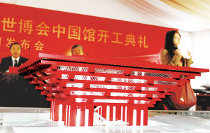 中国2010年上海世博会的核心建筑之一——中国馆昨日正式动工建设。中国馆由建筑面积为2万平方米的国家馆、3万平方米的地区馆以及3000平方米的港澳台馆三部分组成,建筑外观以“东方之冠”的构思主题表达中国文化的精神与气质。图为开工典礼上的中国馆模型。 新华社图片