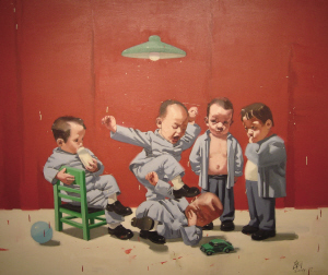 唐志冈在其作品中从不同侧面展现了人类行为。他早年曾参过军,早期作品以军旅日常生活和政治会议为主题,近作则着眼于从事着“成人活动”的孩童。孩童与成人活动的融合创设出一个荒诞不经然而又具有现实讽刺意味的世界,正好体现了唐志冈作品的一大重要特色:强烈的幽默感。为此,他曾坦言道:“我是孩子王,我决不长大!”