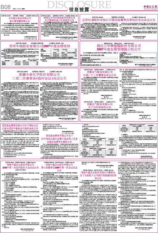 晋西车轴股份有限公司2007年度业绩快报