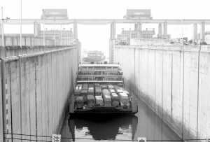 1月29日,滚装船驶入三峡南线船闸。当日,湖北宜昌暂时结束了连续的雨雪天气,因大雪封闭多日的三峡翻坝专用公路下行线开通,滞留的2000多辆车开始陆续通过三峡大坝。为缓解公路压力,三峡通航管理局与中国三峡总公司有关方面协商后,开启三峡船闸让滚装船载车下行的“绿色通道”。