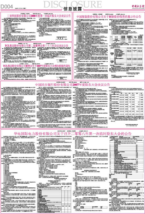 中国民生银行股份有限公司2007年度股东大会决议公告