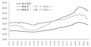 2007年全年,受电煤运输需求旺盛的影响,我国沿海散货运输行情持续攀升。今年初,由于南方持续多天的雨雪天气,使得电煤运输十分紧张,为配合电煤运输,各大船公司纷纷抽调远洋船舶投入沿海,使得煤炭运价出现下跌,从具体运价上看,3月份秦皇岛至广州,天津至南通煤炭的市场运价分别为112 元/吨、97元/吨,较去年年末下降36元/吨,20元/吨。目前煤炭运价已经出现止跌趋势,我们继续看好今年的电煤运输市场。