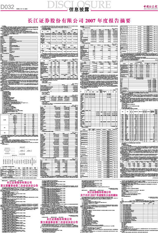 根据《公司章程》的规定,公司定于2008年6月20日召开公司2007年度股东大会,审议议题及其他具体事项详见《长江证券股份有限公司关于召开2007年度股东大会的通知》。