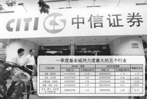 一季报显示,基金减持中信证券等金融券商股的力度较大。 本报资料图片 制图/苏振