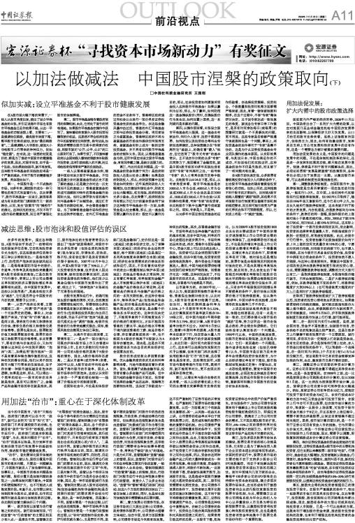 用加法促发展的含义是,中国股市的问题是发展中的问题。不论是体制机制改革的深化,还是进一步发挥和拓展其功能,都只能在发展中展开。低迷、停滞是不利于股市问题解决的,因此,必须切实贯彻“发展是硬道理”的政策取向,各种争论必须让位于发展这一主题。从激活股市来看,可以选择的制度性政策措施包括: