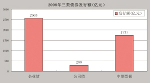 2007年公司债推出之时曾被寄予厚望,不过由于制度限制方面的原因,2008年公司债市场发行可谓波澜不惊。截至昨日,2008年公司债的发行额度为288亿元,仅为中期票据发行量的零头。
