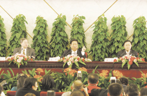 十一届全国人大二次会议6日上午举行记者招待会,国家发展和改革委员会主任张平(左二)、财政部部长谢旭人(左三)、中国人民银行行长周小川(左一),就应对国际金融危机、保持经济平稳较快发展问题回答中外记者提问。 本报记者 谢闻麒 摄